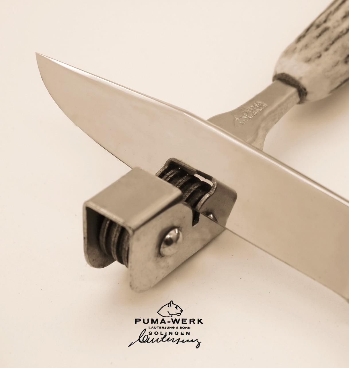 Dieser schöne Schärfstein in einer edelen Eichenholzkasette ist ein Prototyp. Leider wurde er so nie ins Pumaprogramm aufgenommen.