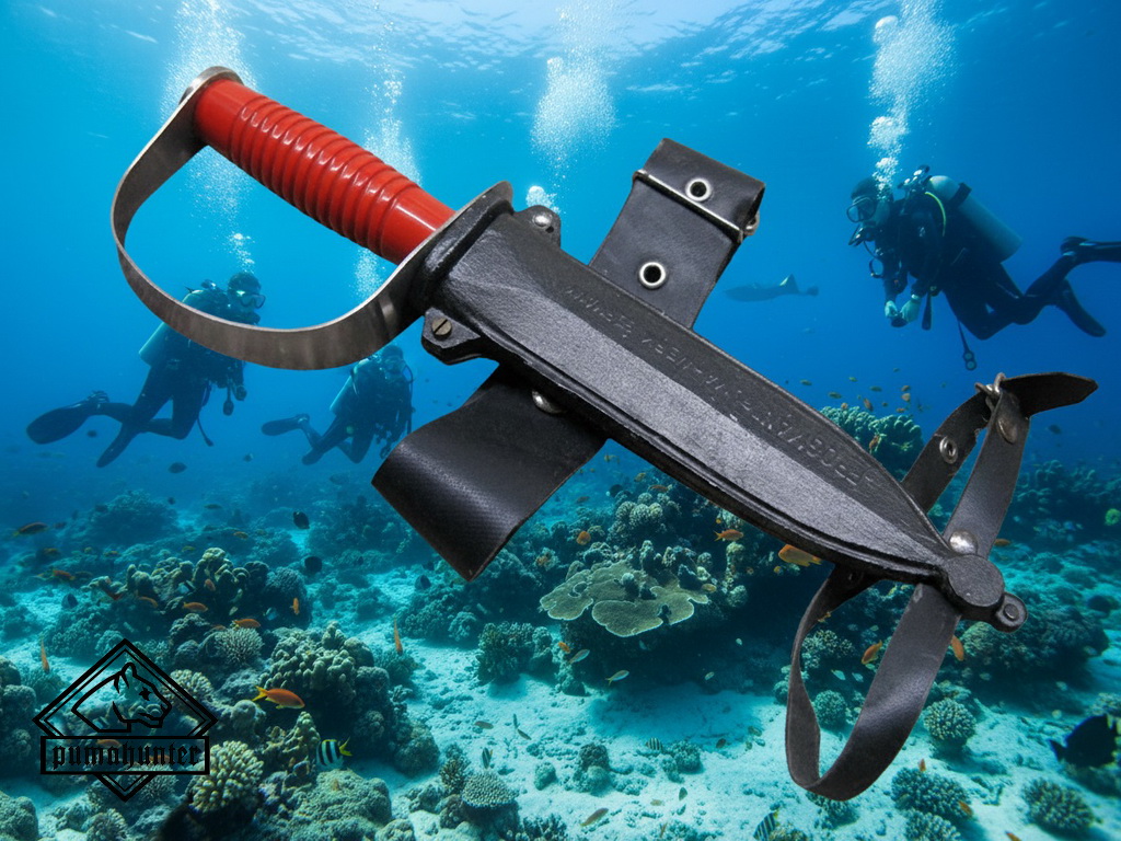 Das alte Tauchmesser 6334 gehörte in den 70ern bei den Kampfschwimmern der Bundesmarine zur Ausrüstung (schwarzer Griff) und wurde auch beim THW und bei den Helmtauchern eingesetzt (roter Griff). Das Frogman hat eine dolchartige Klingenform, wobei die eine Seite eine scharfe Schneide hat und die andere mit einem 2-teiligen scharfen Sägeschliff versehen ist. Der Schutzbügel am Griff ist um 360° drehbar und lässt sich dadurch in der aluminium eloxierten Scheide arretieren (ein sicherer Schutz gegen verlieren).