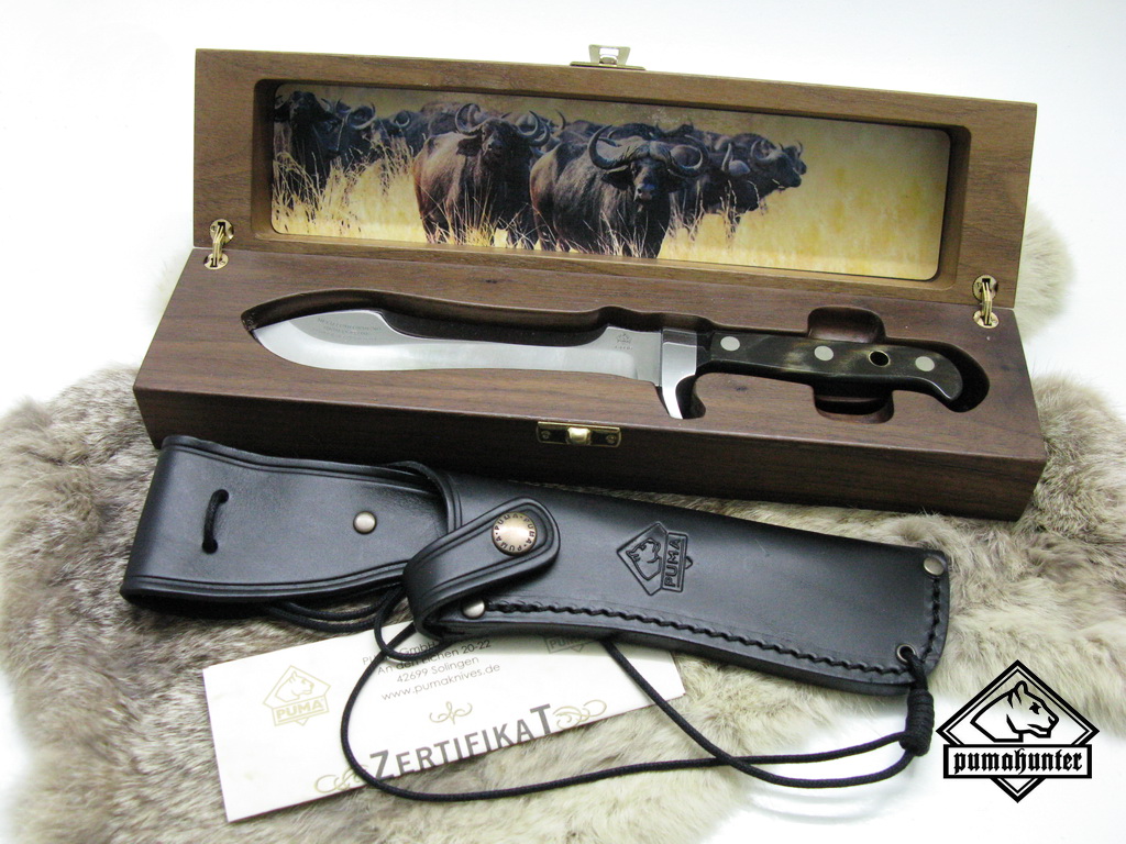 Kleine Auflage des White Hunter "Buffalo" mit einer Beschalung aus poliertem Büffelhorn und einer Scheide aus schwarzem Büffelleder (Fettleder)