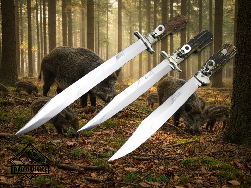 Wie der Name schon mitteilt, dienten diese praktischen Messer damals bei der Schwarzwildjagd zum abfangen der Sau.